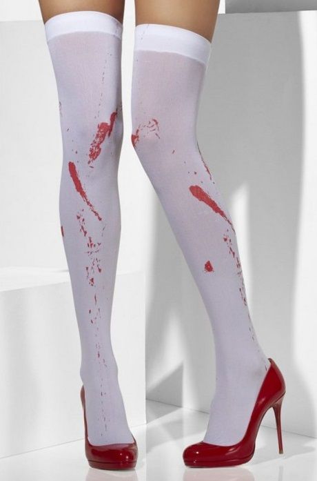 Непрозрачные белые чулки на резинке, с красными пятнами, имитирующими кровь. Данное изделие станет прекрасным дополнением к маскарадному костюму на Хэллоуин. Они прекрасно тянутся и приятны на ощупь. Плотность эквивалентна 20 ден.