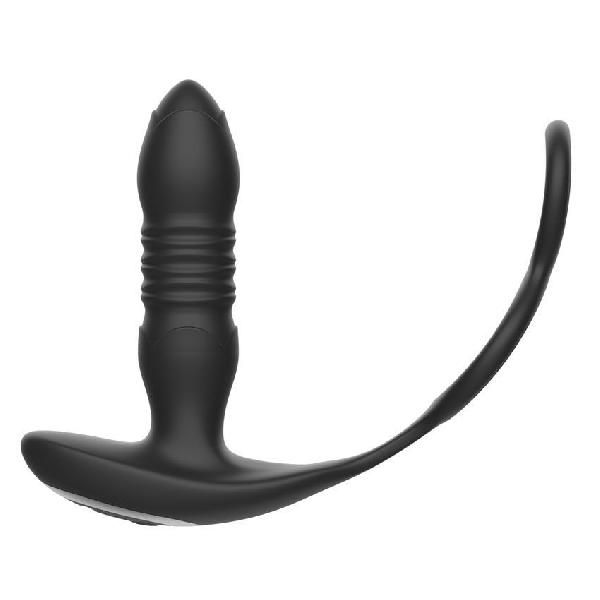 Черный анальный вибромассажёр с возвратно-поступательными движениями и кольцами для фиксации