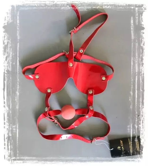 Представленная бондажная маска-сбруя выполнена из натуральной лаковой кожи красного цвета и оснащена кляпом и шорами. Ремни позволяют регулировать размер и надёжно фиксируют подбородок. Все её детали тщательно продуманы и выполнены вручную. Диаметр кляпа - 5,4 см.