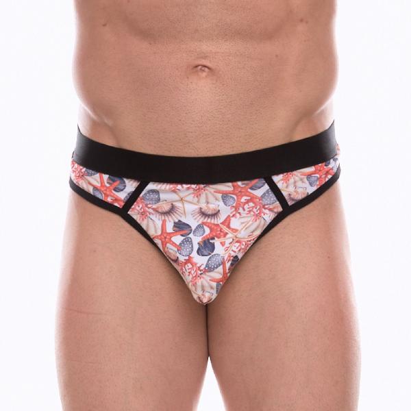 Мужские трусы-стринги с принтом в виде разноцветных ракушек.