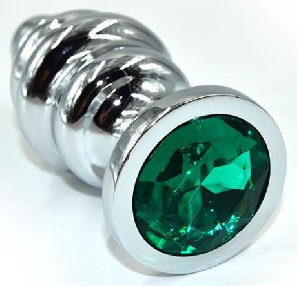 Серебристая анальная пробка из нержавеющей стали с зеленым кристаллом - 8,8 см.