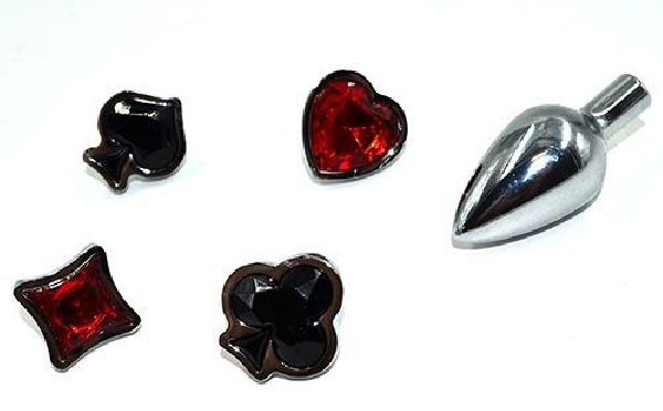Набор из серебристой анальной пробки из нержавеющей стали и 4 кристаллов в форме мастей - 7,6 см.