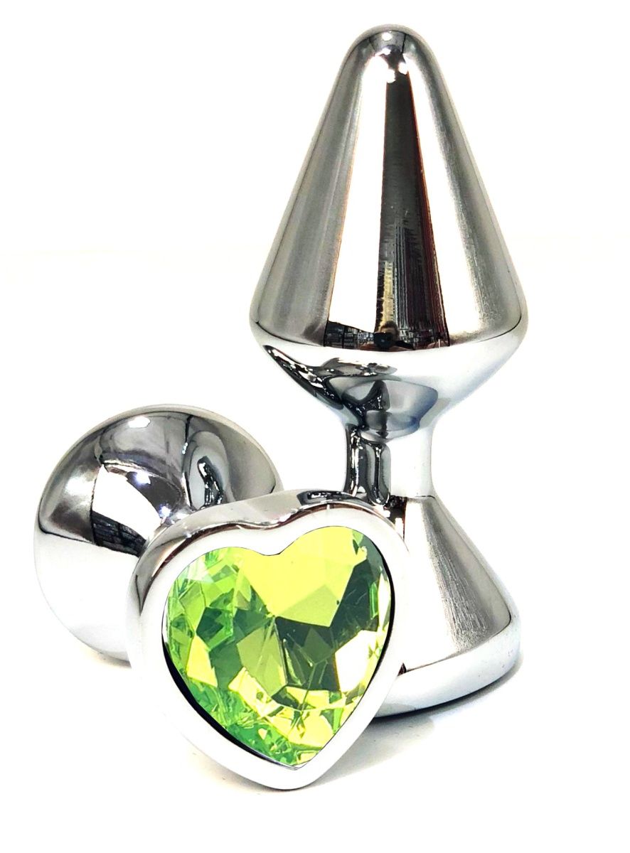 Серебристая анальная пробка с лаймовым кристаллом-сердцем - 8 см.